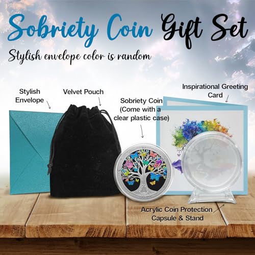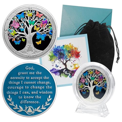 Specification: 1 Year Sobriety Coin One Year Sobriety Chip Achievement Medallions AA Coins Sobriety Gifts for Men Women Butterfly Sober Token Alcoholics Anonymous Gift with Capsule, Display & Card