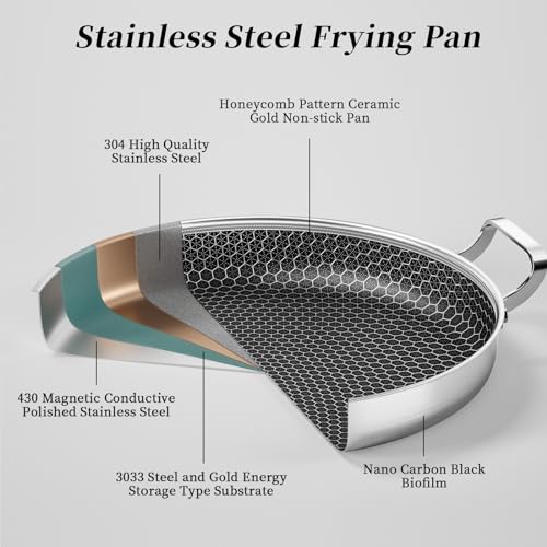【HEALTHY NON-STICK WOK】 Use chemical-free stainless steel frying pan to make healthy food for your family. The honeycomb structure and crystal dot design keeps food out of contact with the bottom of the pan and suspended between the physical particles of the pan walls, which can significantly improve non-stick and even heating, making flipping easier and shortening cooking time.