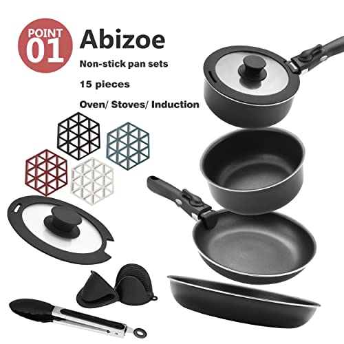 15-piece nonstick cookware set includes 22CM fry pan, 26CM fry pan with lid, 18CM pot, 20CM pot with lid, 1 Silicone Tong, 2 Mini Silicone Oven Gloves, 4 Silicone Trivet Mats,2 Detachable handle(Cooking Utensils Set Heat resistant withstand temperatures ranging from -22° to 430°F not produce any hazardous fumes)