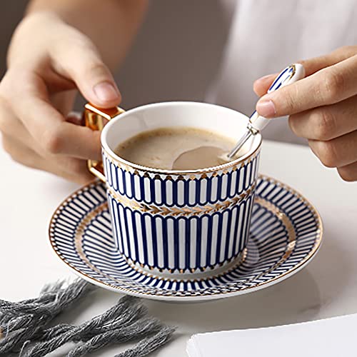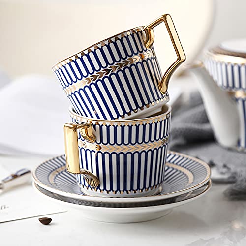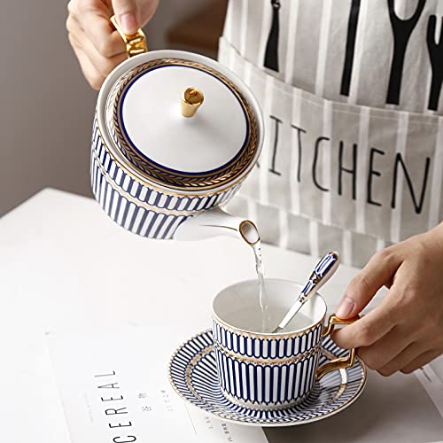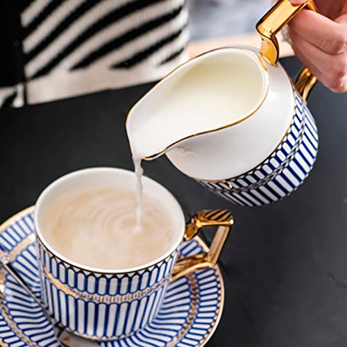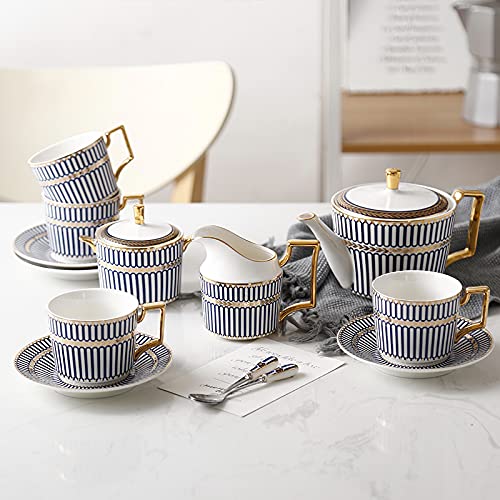 15 Pieces Porcelain Tea Set Coffee Cup and Saucer Sets, Blue Stripes Tea Service with Teapot, Sugar Bowl, Cream Pitcher,Spoons