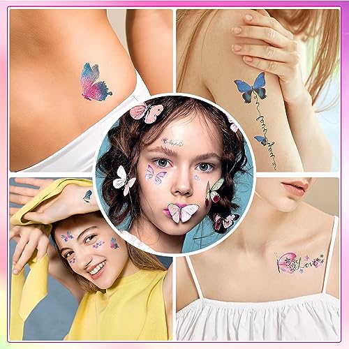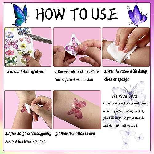 ✨【Easy to Paste and Remove】Our butterfly temporary tattoos are easy to use, Clean and dry the skin before application, cut out the desired pattern, remove the clear protective sheet, place the pattern face down on the desired area, dampen the paper with a damp towel or sponge, wait 20 seconds and remove the backing paper and you are done. Easily removed with alcohol, baby oil, olive oil, soap, and make-up remover.