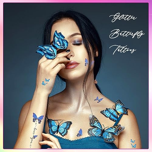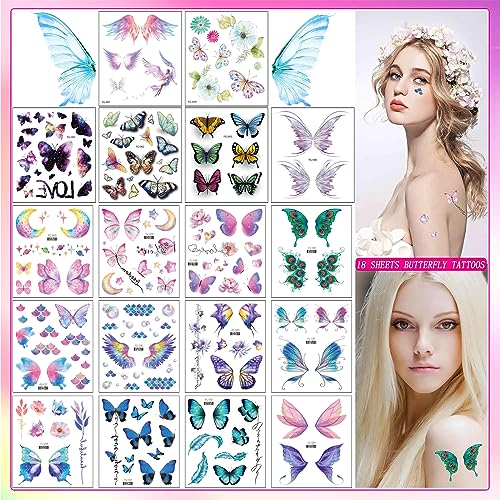 18 Sheets Glitter Butterfly Temporary Tattoos Sticker Colorful Waterproof Flash Fairy Wings Body Art Shiny Butterflies Flowers Eye Face Makeup Fake Tattoos for Women Girls Eye Decorations Supplies