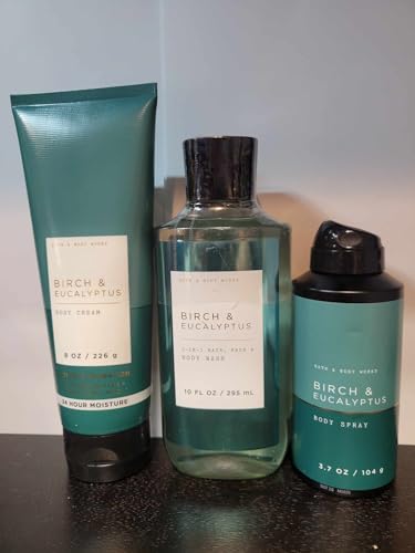 Specification: 3 Bath body works Birch & Eucalyptus Face & Body Wash 10oz – Ultimate Hydration Body Cream 8oz – Body Spray 3.7oz