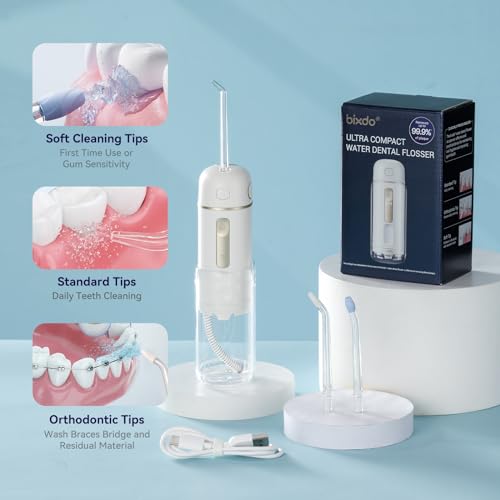 Package Warranty & Support: During the warranty period, please contact the Bixdo Customer Service Team for fast and friendly support if you have any questions. We will do our best to resolve any issues to your satisfaction. The package includes: 1 Oral Irrigator, 3 Tips, 1 Charging Cable (Adapter not included), 1 Portable Bag, and 1 Instruction Manual. (*Each tip is recommended to be replaced every six months. Replacement tips are available for purchase in our store.)