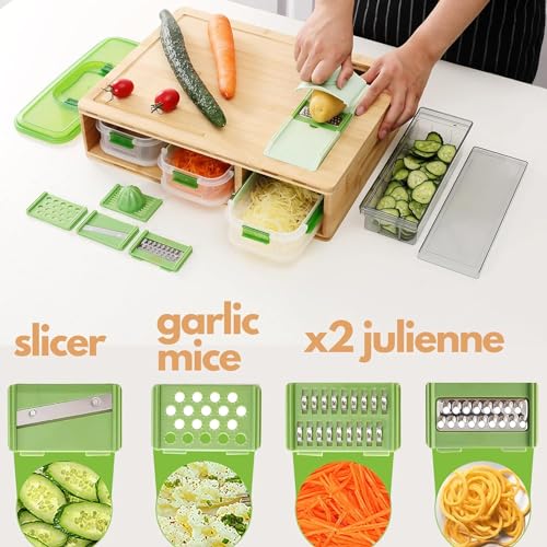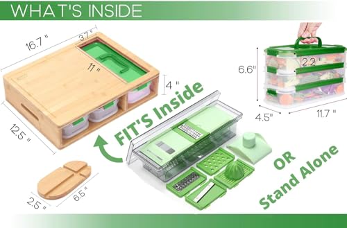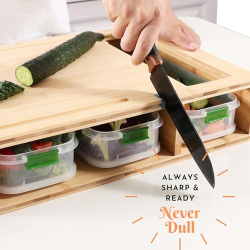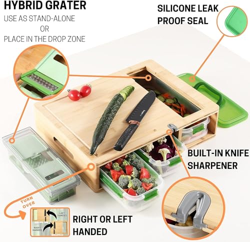 π¨βπ³ BAMBOO CUTTING BOARD WITH CHOP N’ DROP DESIGN: Our Chop N’ Drop design allows you to simultaneously cut and slide your veggies, fruits, or meats into containers that can be stacked; air tight and ready for storage or transport. Check out our demo video in the picture carousel, on the left, to see Chop N’ Drop in action!