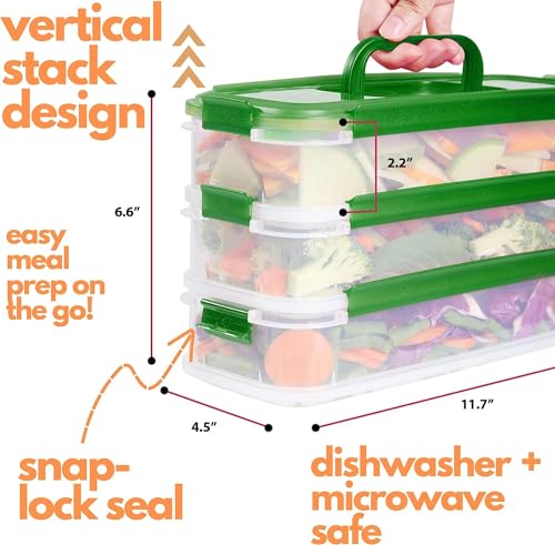 π STACKABLE AIR-TIGHT CONTAINERS (WITH 2 COLOR OPTIONS): Stackable, interlocking containers with snap lock design. 3 trays and 1 universal lid with handle keeps your food fresh and leak-proof. Extra large 1.5 liter capacity each (4.5 liters total). BPA-free, that never alters taste. Containers are microwave and dishwasher safe.
