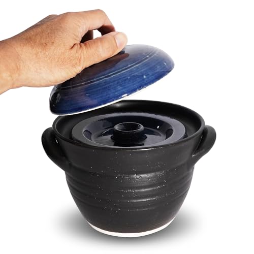 Specification: Banko-ware Donabe Japanese Earthenware Rice Pot with Double-Lid Technology – Elegant Jet-Black & Blue Design – Ensures Fluffy Rice Every Time – Includes English Manual – Made in Japan (1-2 per)