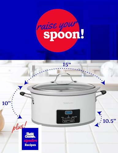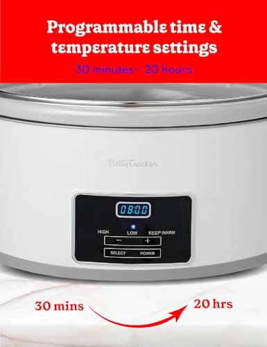 Specification: Betty Crocker 6-Quart Oval Digital Slow Cooker, Programmable Crock Pot Up to 20 Hours, Electric Cooking Pot with LCD Digital Display, Removable Stoneware Crock Liner, Betty Crocker Cookbook,White