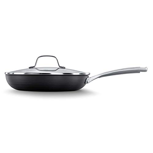 The Calphalon classic nonstick 10″ Omelette fry pan with cover is made with dual-layer nonstick for extra-easy food release and cleanup, and constructed from durable hard-anodized aluminum for fast and even heating. The long stainless steel handle feels comfortable in your hand and stays cool on the stovetop. Gently sloped sides and flared edges make this medium nonstick frying pan ideal for preparing eggs, omelets, and other delicate foods. Includes oven-safe tempered glass lid to help foods retain moisture when cooking. Care: hand wash only. Never place cookware in an automatic dishwasher, or use Abrasive cleaning pads or cleansers.