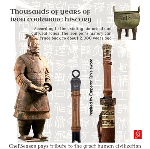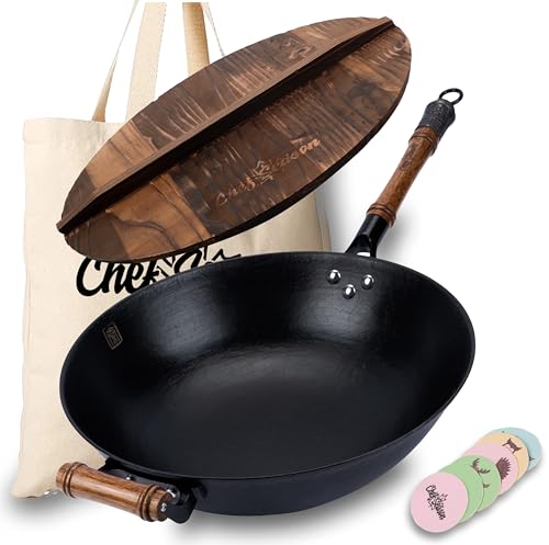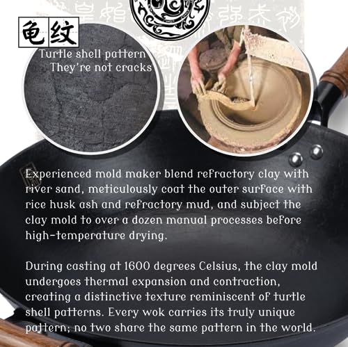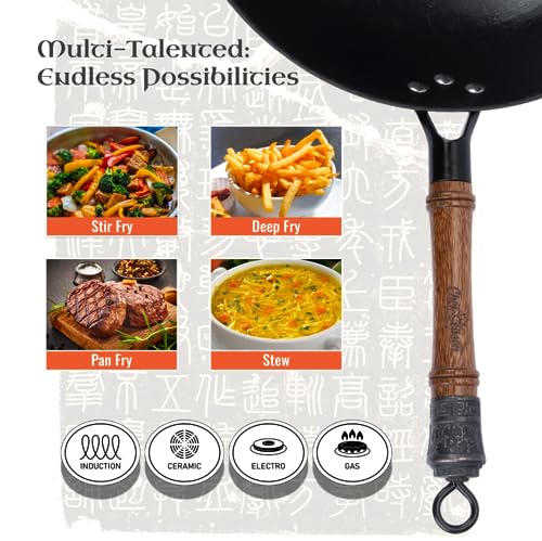 Specification: Cast Iron Wok Flat Bottom 14.2 inch with Wooden Lid, Un-Coated & Pre-Seasoned Chinese Wok, fits Electric, Induction, Gas Cooktops, Free Shopping Bag