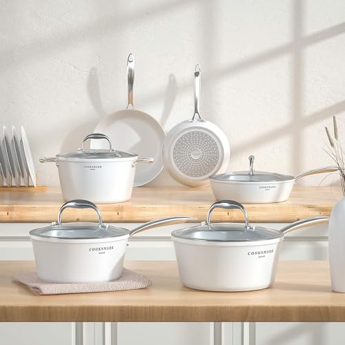 Specification: COOKSMARK Nonstick Ceramic Cookware Set, 10 Pieces White Pots and Pans Set with Glass Lids & Stainless Steel Handles, Induction Cookware Set & Dishwasher Oven Safe, Scratch-Resistant