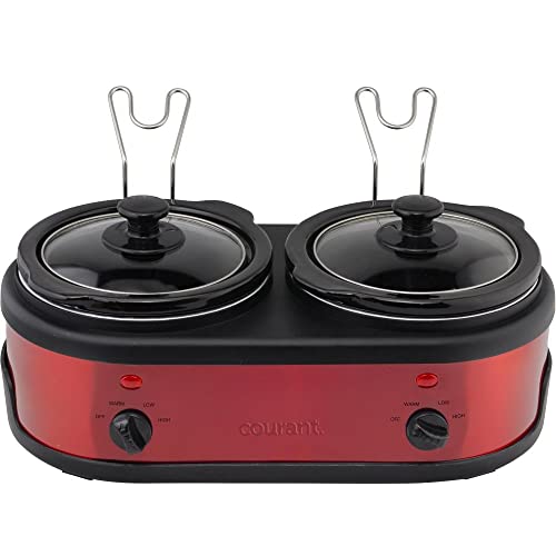Specification: Courant 3.2-Quart Double Slow Cooker (1.6-Qt each) w/Warm Settings, Stainproof Stoneware Pots and Glass Lids – Red Stainless Steel