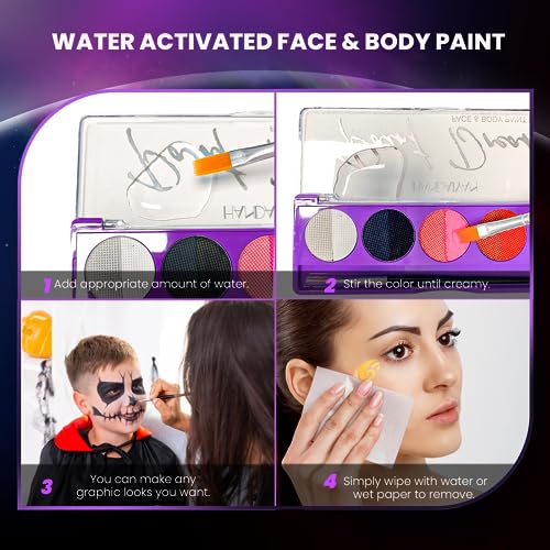 【Skin Friendly】The professional face painting kit is made of safe and non-toxic materials, with a mild and non irritating formula. Hypoallergenic, suitable for various skin types. The face painting kit for party is smudge proof and long-lasting durable transfer-proof . Unless removed, your color will not fade. Suggest conducting a small skin patch test.