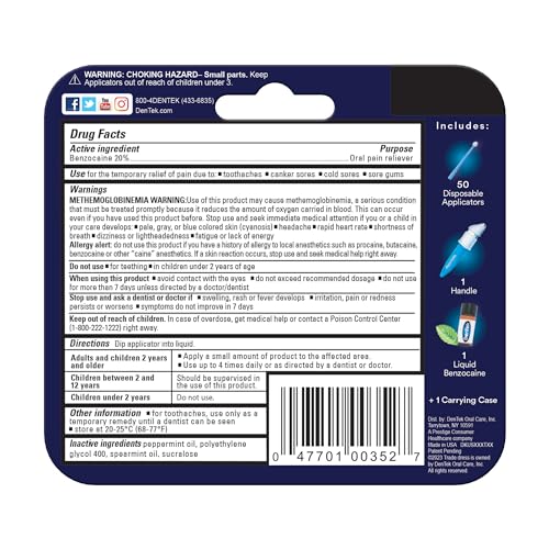 DenTek Instant Pain Relief, Advanced Kit includes 1 bottle of Benzocaine (20%) 3.5 mL, 50 count disposable applicators, applicator handle and carrying case