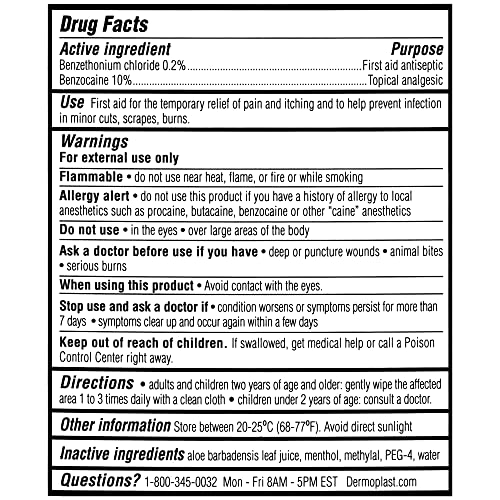 Formulated with 10% benzocaine (a topical pain reliever) and a no-sting antiseptic, plus soothing aloe to moisturize skin