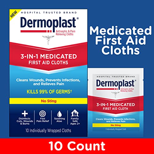Specification: Dermoplast 3-in-1 Medicated First Aid Cloths, Analgesic & Antiseptic Wipes for Treating Minor Cuts, Scrapes and Burns on the Go, Sting Free Formula, 10 Individually Wrapped Cloths (Packaging May Vary)