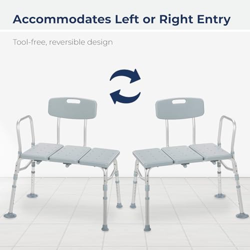Upgrade your bathroom with the Drive Medical plastic sliding shower chair and bathtub bench; the ideal accessory for anyone who has difficulty getting in and out of the tub or shower. This bathtub seat features a reversible bench and extension legs with extra-large suction cups that help lock it into place for added versatility and safety. The plastic transfer bench has a pinch-free lever that allows the push pins to be depressed without accidentally squeezing fingers. It features tool-free assembly for the back, legs and arms. It also comes with “Dual Column” extension legs that are adjustable in 0.5″ increments. This Drive Medical transfer bench has a sturdy A-frame design with a backrest that ensures maximum stability. It is also constructed of durable blown plastic designed to withstand daily use. Back support is reversible to accommodate left or right tub entry. Backed by a limited lifetime warranty from Drive Medical, a leading brand of bathroom safety products, mobility aids, and other medical goods for more than 20 years, you can purchase with confidence.