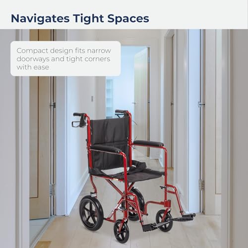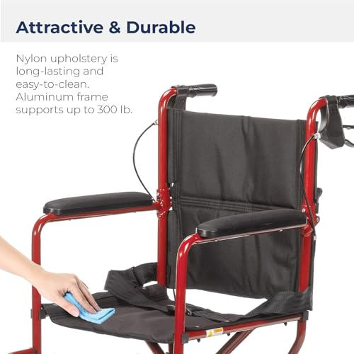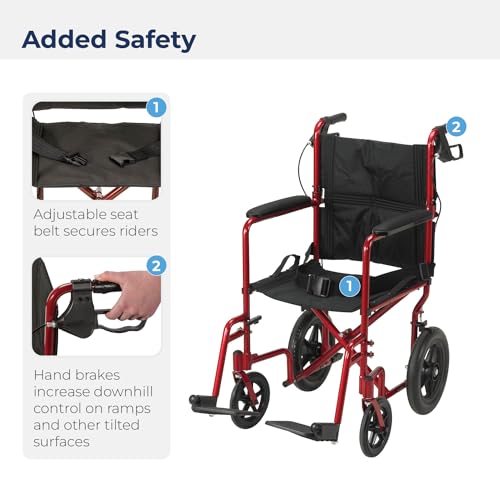 Drive Medical EXP19LTRD Lightweight Expedition Folding Transport Wheelchair with Hand Brakes, Red