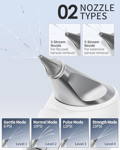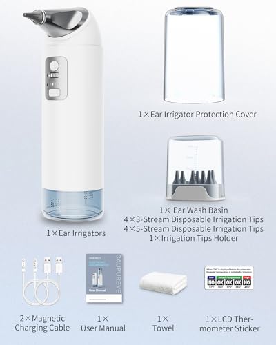 👂【Safe and Professional Ear Care】The Caupureye Ear Cleaner is designed to meet your needs. Its 4 cleaning modes cater to different ear types, from the gentle mode (Level 1) suitable for sensitive ears and daily care to the powerful mode (Level 4), which tackles stubborn earwax. The ear wax removal kit even comes with a temperature monitor sticker, so you can monitor the water temperature and clean within the comfortable range of 37°C to 40.5°C, ensuring a safe and soothing experience.