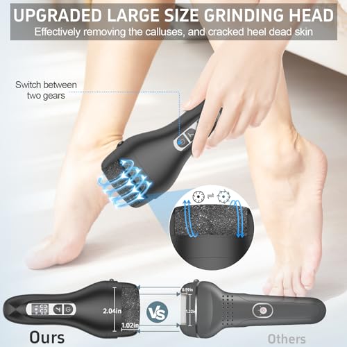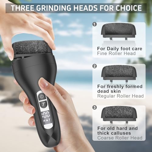 【Updated Wider and Larger Grinding Heads ,3 Replace Roller Heads】 ━ The electronic callus remover of upgraded grinding rollers removes dead skin in a wider and larger area, thus effectively removing the calluses, and cracked heel dead skin.In addition,our callous removers for feet has 3 different quartz sand grinding heads,rough grinding head can remover stubborn horny dead skin , medium grinding head can remover rough dead skin, fine grinding head use for daily care. You can choose suitable grinding head according to the skin to care,make your feet restore the delicate and smooth skin.