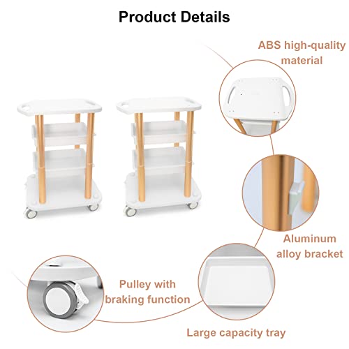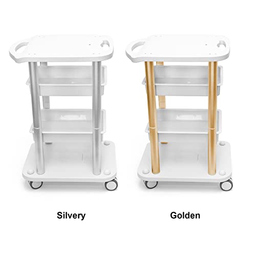 【STRONG AND DURABLE】The beauty trolley is made of aluminum alloy and ABS high-quality materials, which are environmentally friendly and durable, simple and beautiful, and not easy to leave scratches. Gold is a color obtained by oxidation of aluminum alloy and is highly decorative. Stable performance, corrosion resistance, high temperature resistance 300 degrees, sun resistance and discoloration, long service life. Aluminum alloy support column, can load more than 15kg, not easy to deform.