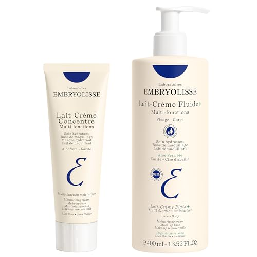 Embryolisse Lait-Crème Concentré & Lait Creme Fluid+ Duo, Multifunction Daily Moisturizer, Primer, and Makeup Remover. Lightweight Face & Body Cream, With Shea Butter & Aloe Vera, 2.54, 13.52 Fl Oz