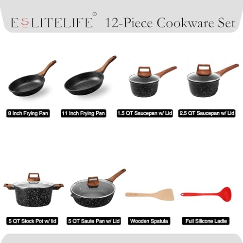 Specification: ESLITE LIFE Nonstick Cookware Sets, 12 Pcs Granite Coating Pots and Pans Set Kitchen Cooking Set, Compatible with All Stovetops (Gas, Electric & Induction), PFOA Free, Black