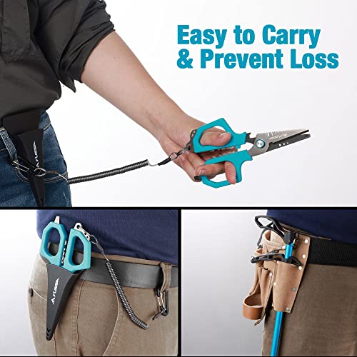 Multifunction Fishing Scissors with Sheath – Scissors include braided line snips, tube cutter, split shot crimper, cutting notch, hook regulator, tighten knots, bottle opener, slot screwdriver, and lanyard hole to secure. The super sharp and corrosion resistant 5CR15 stainless steel blades are dual micro-serrated, can cut braided line, monocarbon and fluorocarbon easily. Rubber coated handles provide comfort and secure grip