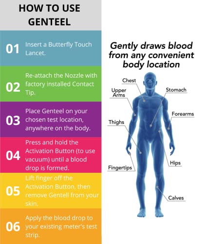 Vacuum Technology – The Genteel lancing device is the world’s only lancing device that uses vacuum technology to draw blood. No more sensitivity and squeezing. Save yourself from pain and get blood anywhere from your body.