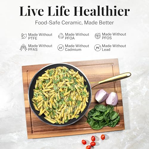ULTRA NONSTICK CERAMIC SURFACE: Healthy cooking is just a step away. Thanks to a nonstick surface that’s 2x more durable than previous generations, this cooking pan set needs minimal to no oil or butter. And they’re designed to properly conduct heat so food cooks evenly.