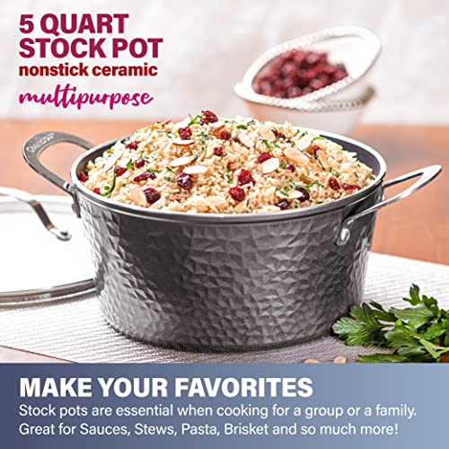 Complete Cookware Set: This Hammered design cookware set includes everything you need to start your cooking. The set comes with an 8 and half inch frying pan, a 10 and quarter inch frying pan with a lid, a 1 and a half quart saucepan with a lid, 2 and a half quart saucepan with a lid, a 5 quart stock pot with a lid, and a stainless-steel steamer.