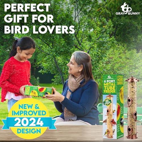Gray Bunny Metal Bird Feeders for Outdoors Hanging, Brushed Copper Squirrel Proof Bird Feeders with Locking Lid & Adjustable Hanger, Chew-Proof, Weather Resistant – 16 Inches 6 Port