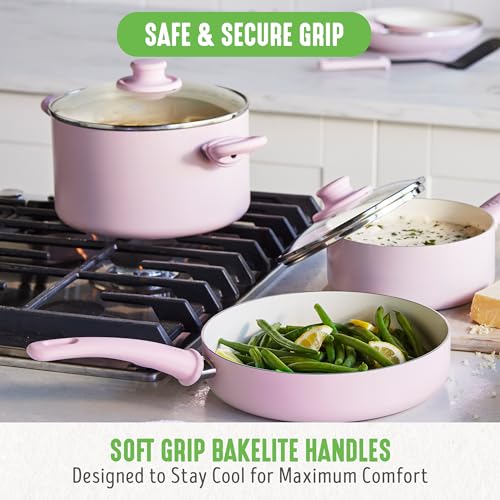 GreenLife Soft Grip Healthy Ceramic Nonstick 16 Piece Kitchen Cookware Pots and Frying Sauce Saute Pans Set, PFAS-Free with Kitchen Utensils and Lid, Dishwasher Safe, Soft Pink