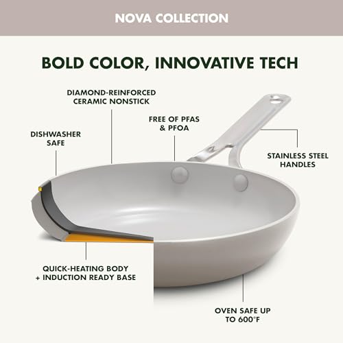 Finished in bold hues that elevate every space, this 10-Piece Cookware Set from GreenPan Nova includes all you need to cook with confidence. Our Thermolon healthy ceramic nonstick coating features diamond-enhanced layers is free of PFAS, PFOA, lead & cadmium. The heavy-gauge aluminum bodies are built for daily durability and deliver excellent heat conduction. Take these pans anywhere thanks to the specially designed induction base suitable for all stovetops, including induction. The forged aluminum lids add even more strength on top and feature a small divot that doubles as a utensil rest, minimizes contact. For ultra-convenience this collection is dishwasher safe so you can spend less time cleaning and more time eating.