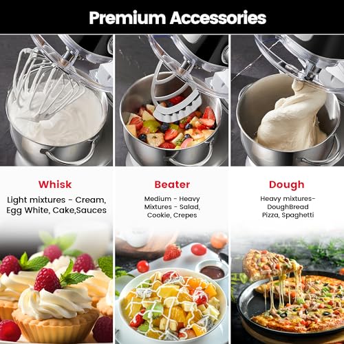 【3 IN 1 Accessories Dishwasher Safe】Our stand mixer features upgraded stainless steel, 3-in-1 accessories including the Egg Whisk, Dough Hook, and Flat Beater for easy installation and durability. All of the attachments for the food mixer are dishwasher-safe for quick and easy cleaning.The electric mixer with modern design look, not only work well but also look well.