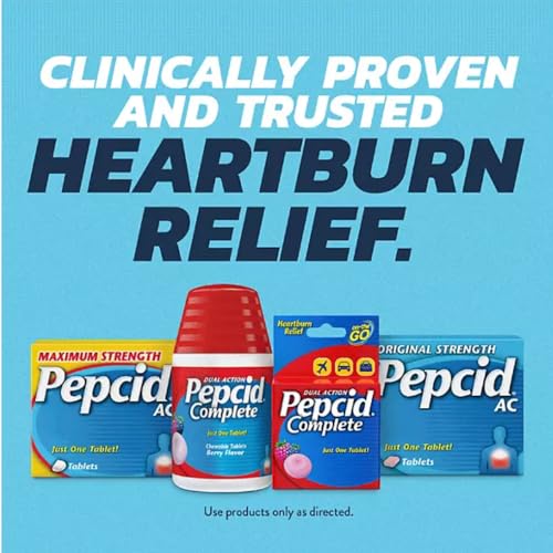 DUAL ACTION RELIEF: Pepcid Ac Maximum Strength Complete offers dual action relief from heartburn and acid reflux with its combination of an stomach pain relief and natural antacid chewable tablets, providing fast and effective relief.