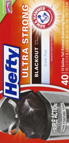 Trust Hefty Ultra Strong Tall Kitchen Trash Bags to keep your kitchen waste contained & out of sight. The black color hides unsightly messes, which means these innovative kitchen garbage bags will keep your garbage in the dark. Thanks to Triple Action Technology, these tough Hefty kitchen trash bags resist punctures, leaks, & tears, providing the highest protection available in flexible garbage bags. That stretchy strength means you don’t have to worry about unexpected bag breakage & inconvenient messes. Don’t be afraid to use these kitchen trash bags for tougher jobs, such as garage, basement & construction cleanup. A break-resistant grip drawstring makes it easy to close the bag & cart it away without incident. As a bonus, these unscented trash bags include a patented Arm & Hammer odor neutralizer to keep unpleasant smells at bay. All Hefty trash bags are backed by a 100..