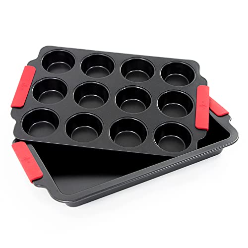 Hell’s Kitchen 8 Pc Nonstick Bakeware Set with Silicone Handles, Cookie Sheet, Muffin Pan, Loaf Pan, Cake Pan Set
