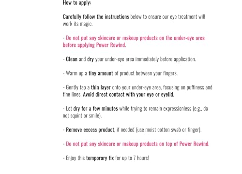 You can’t pause aging, but you can rewind it with our under-eye de-puffing and smoothing, Power Rewind Temporary Eye Tightener. This groundbreaking fix instantly deflates the look of eye bags and crow’s feet, and smooths the appearance of skin around your eyes – all with a cutting-edge duo of EyeLiss (a powerful peptide complex) and Inst’Tight (honey locust seed-derived ingredient). To get the full age-rewinding effects, proper application is a non-negotiable here. So follow the instructions in the “how to use” tab to watch the appearance of under-eye bags deflate to a smooth surface with a flawless, filter-like effect that lasts up to 7 hours.