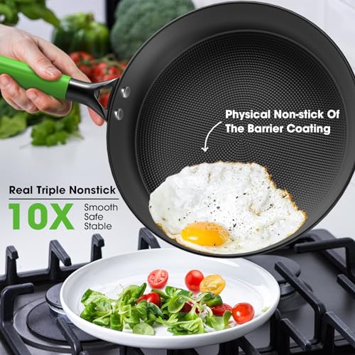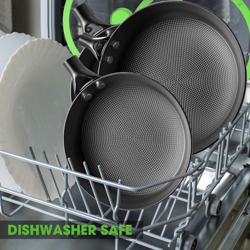 🎊【High Compatibility Non-Stick Fry Pan】The fry pan is suitable for a variety of cooking methods, including frying, boiling, stirring and grilling. Suitable for all stoves including halogen, gas, ceramic, oven and electric, making it perfect for all your cooking needs. The nonstick frying pan set is dishwasher safe, but hand washing is recommended to maximize its lifespan. (Note: Handles should be removed before placing in dishwasher and oven).