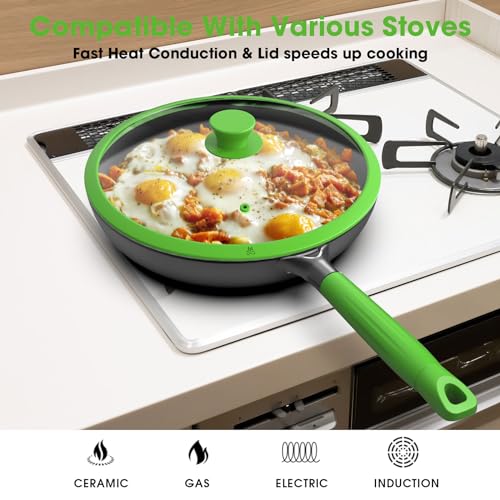 🎉【Upgraded experience with non-stick frying pan with lid】The frying pan has 2 creatively designed vent grooves on the edge of the lid, and the tempered glass lid can maintain high visibility and prevent soup from overflowing, speeding up cooking and locking in the delicious flavor of food. Easy to clean, just rinse with water and mild detergent for a quick rinse when cooking is done.