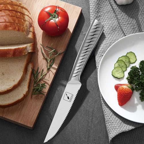 [High-end Steel Blades]: The serrated steak knives forged from high carbon and density of steels, tarnish-resistant and rust-resistant. Special serrated edge design and one piece Full-Tang blade for the sharpness, stability and balance on precise cutting.