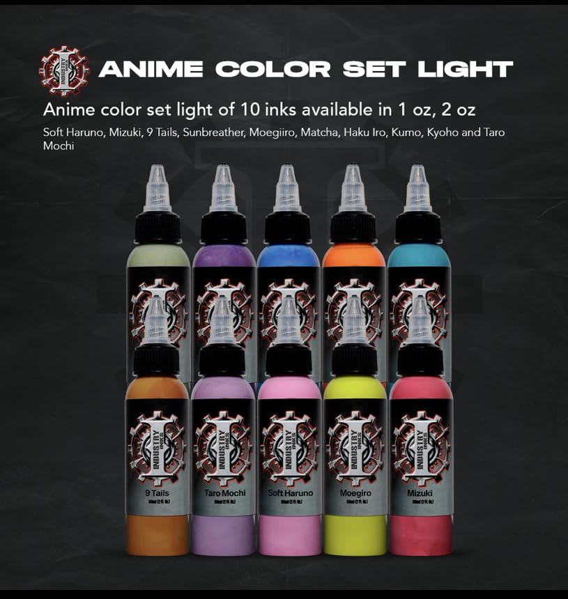 Industry Ink’s 10 Color Anime Light Set is a great addition to any professional tattoo artist’s collection it will make your Anime Tattoos Pop. These high-quality inks are ideal for creating stunning tattoos with rich, dynamic color that lasts.