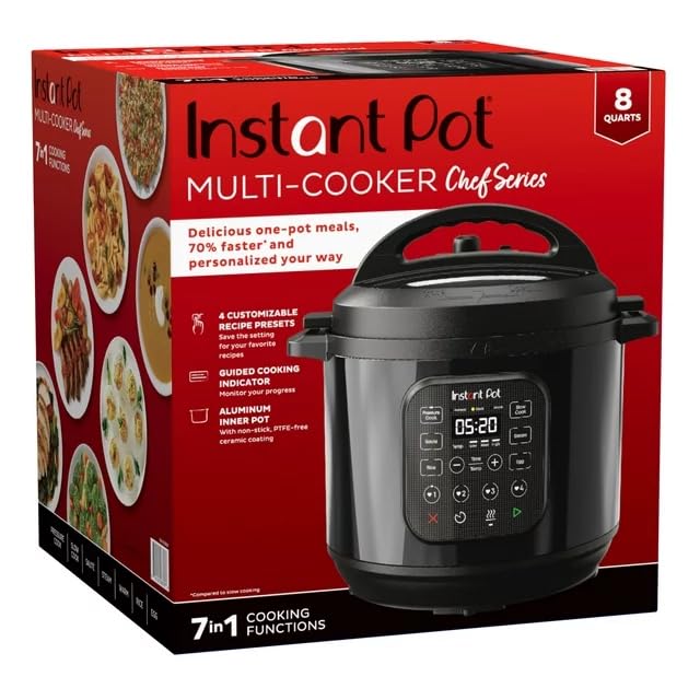 The new 8qt Instant-Pot Chef Series Multi-Cooker is both beautiful and easy to use. Cooking is simple with 7 built-in cooking functions, 4 customizable presets to save your favorite cooking setting, and a sturdy aluminum inner cooking pot with non-stick ceramic coating. The black stainless steel design will look beautiful on your countertop. It serves up to 8, so it’s perfect for your growing family or for batch cooking. When you’re done, cleanup is simple with a dishwasher-safe pressure cooking lid and non-stick ceramic-coated cooking pot. This Instant-Pot Chef Series will quickly become your favorite appliance, helping you make delicious meals quickly and easily.