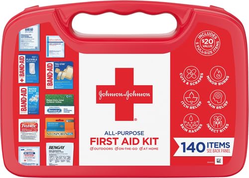 140-piece Johnson & Johnson All-Purpose Portable Emergency First Aid Kit is ideal for home, in cars, outdoors, dorm rooms, and while camping, cooking or on-the-go to help care for minor cuts, scrapes, burns, itches, pain, skin rashes and insect bites