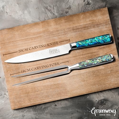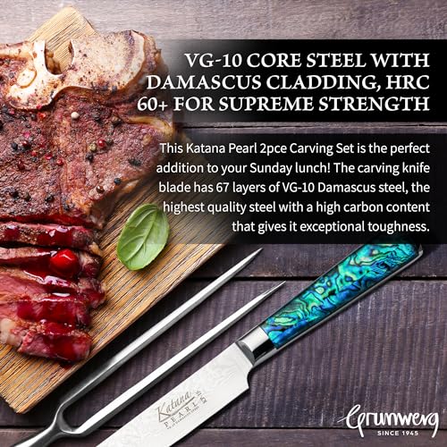 Katana Pearl Kitchen Knives – Premium Quality Japanese Damascus Steel Blades with Abalone Pearl Resin Handle – 2 PC Carving Knife & Fork Set