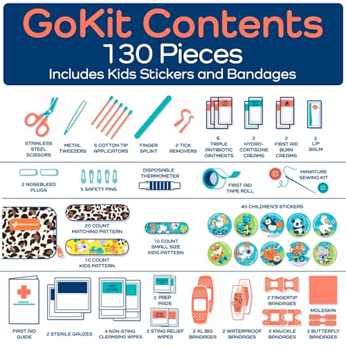 Keep Going Travel First Aid Kit for Kids – 130 Pc. for Car, Purse, Diaper Bag, Backpack, & Suitcase, with Latex-Free Bandages – 7 x 5 x 2 in. TSA-Approved