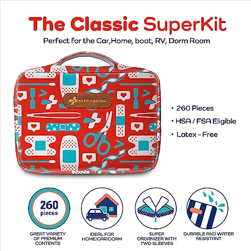 KeepGoing Large Home First Aid Kit for Kids – 260 Pc. First Aid Kit for Car, Home, Dorm, & Boat with Latex-Free Bandages – 10 x 7 x 3.5 in. Travel First Aid Kit (The Classic)
