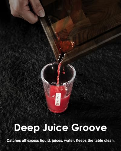 ✅[𝗗𝗲𝗲𝗽 𝗝𝘂𝗶𝗰𝗲 𝗚𝗿𝗼𝗼𝘃𝗲] The meticulously carved juice groove on the front side of the board serves as both a practical and aesthetic feature. Its generous depth ensures efficient drainage of excess liquids, maintaining cleanliness and preventing countertop mess. A strategically positioned spout allows for effortless pouring of collected juices, offering a seamless cooking experience and facilitating hassle-free cleanup.