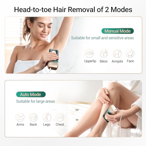 ✿Head-to-Toe Hair Removal✿: This laser hair removal device can go where hair you unwanted. Face, arms and legs to the bikini area, and effective to use everywhere. The Auto-Glide Mode with fast flash makes full body treatments at home super quick. Manual mode is mainly used for small area, such as bikini line, armpit, lips.